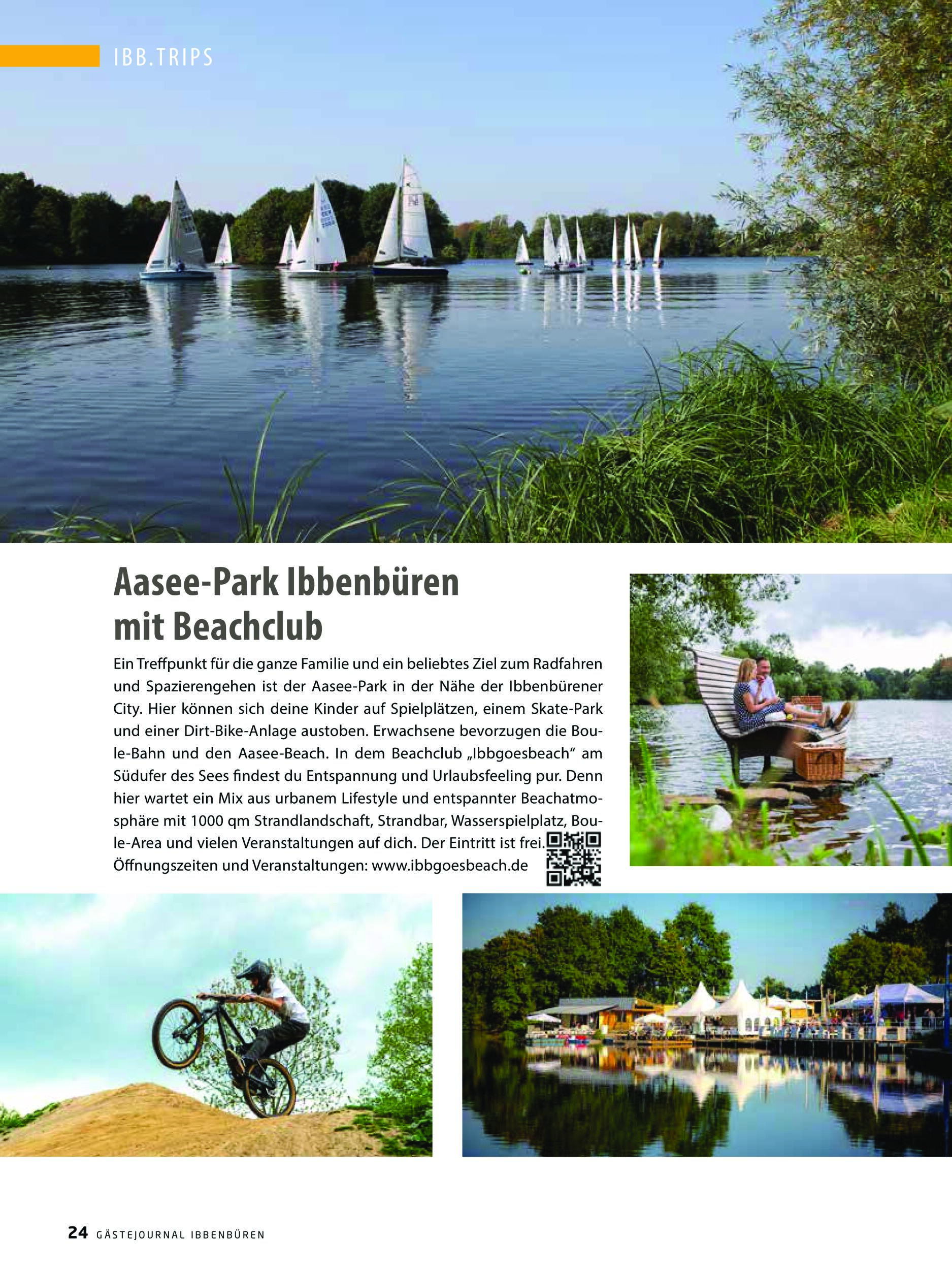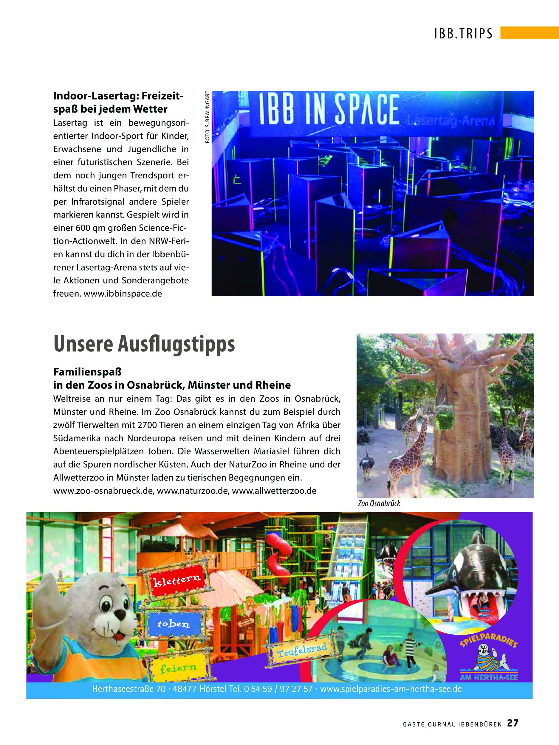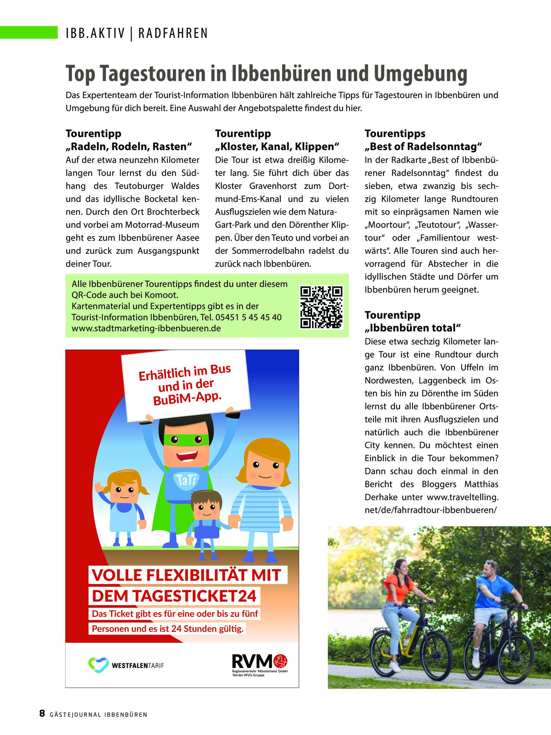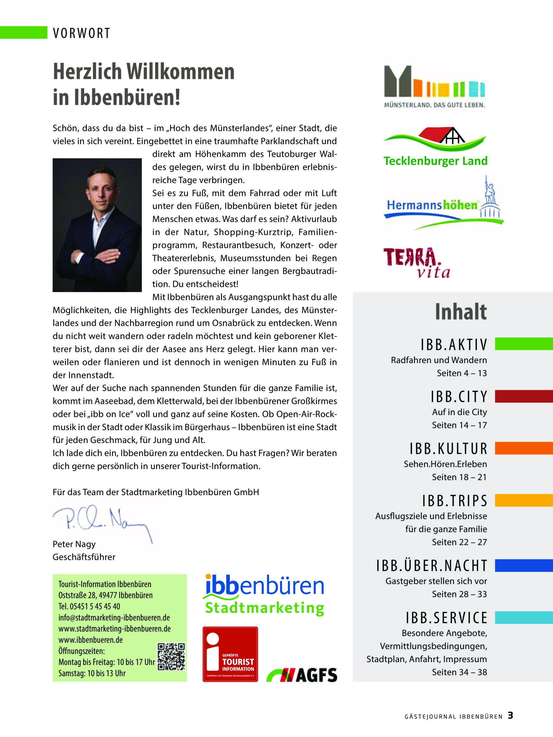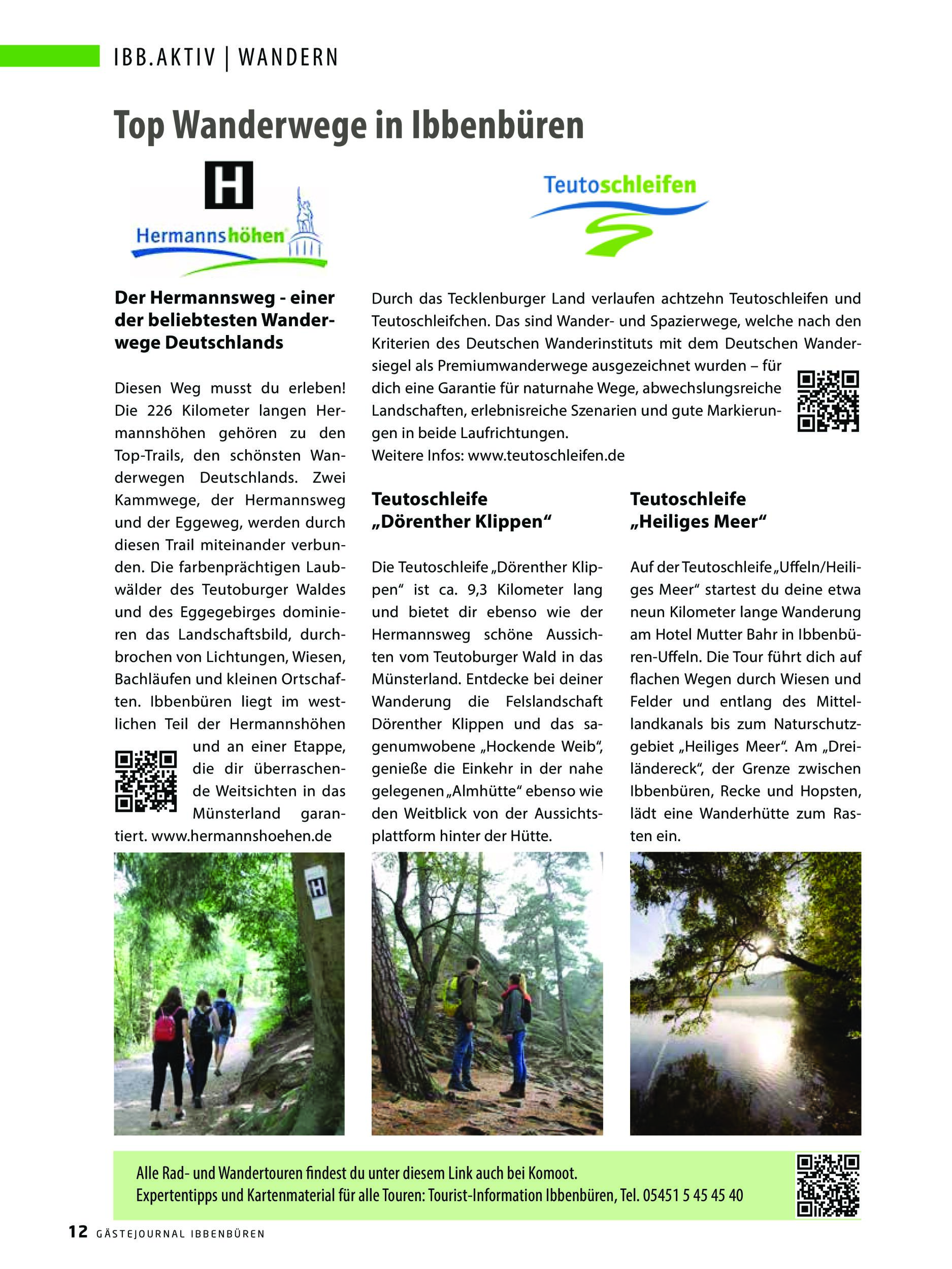 Mit zahlreichen Tipps und Informationen gibt das Gästejournal Ibbenbüren einen umfassenden Überblick über die Ibbenbürener Freizeiteinrichtungen sowie über Veranstaltungshighlights in der Innenstadt und in den Ortsteilen. In dem Journal wird über die Themen Wandern und Radeln ebenso informiert wie über Stadtführungen und kulturelle Angebote. Auch Ausflugsziele wie Dörenther Klippen, die Sommerrodelbahn, der Kletterwald, der NaturaGart-Park, das Aaseebad und die Ibbenbürener Museen sind in dem Journal enthalten.