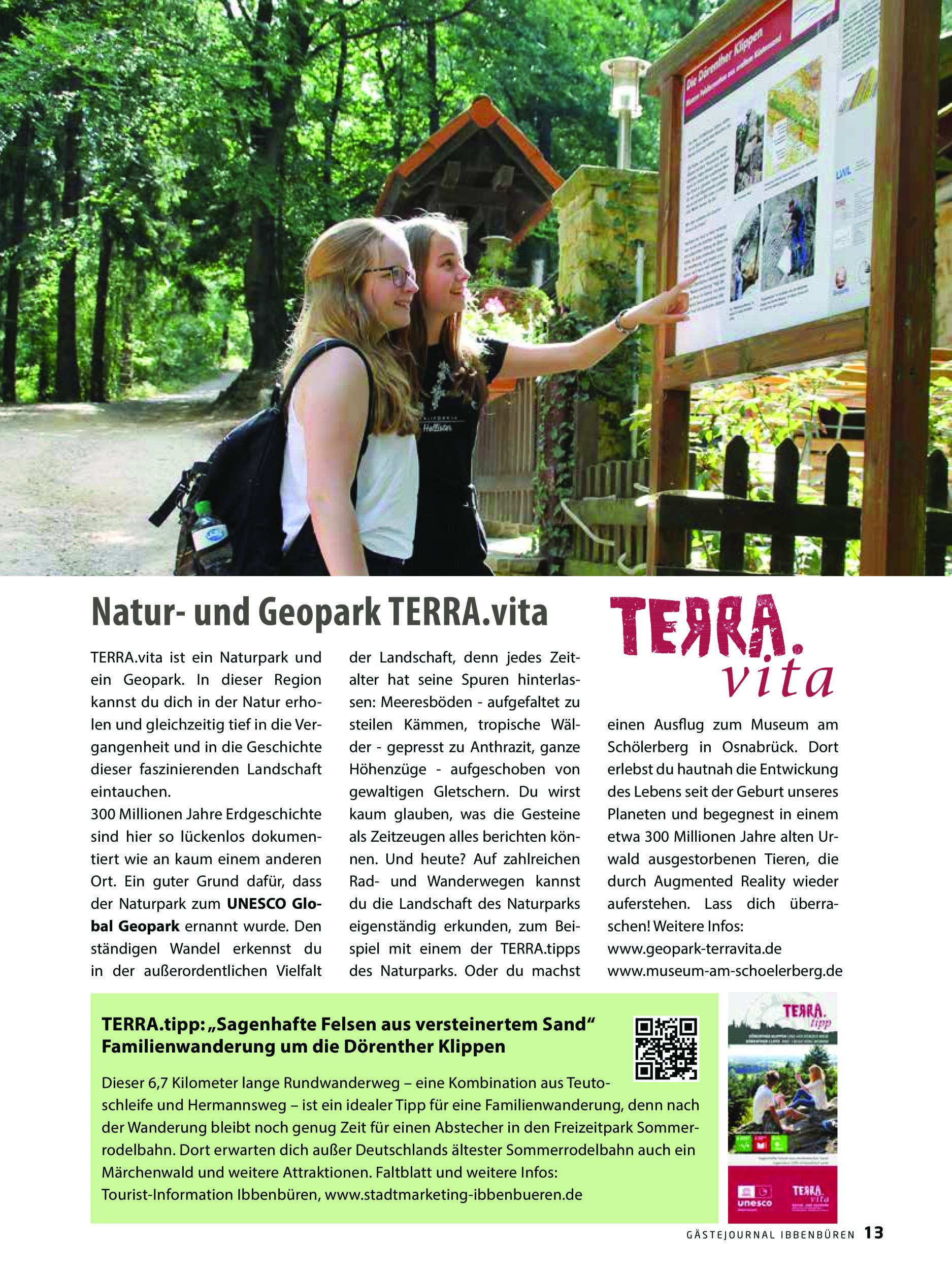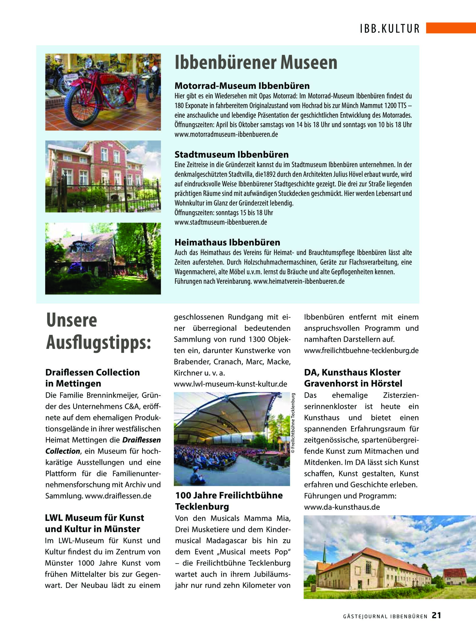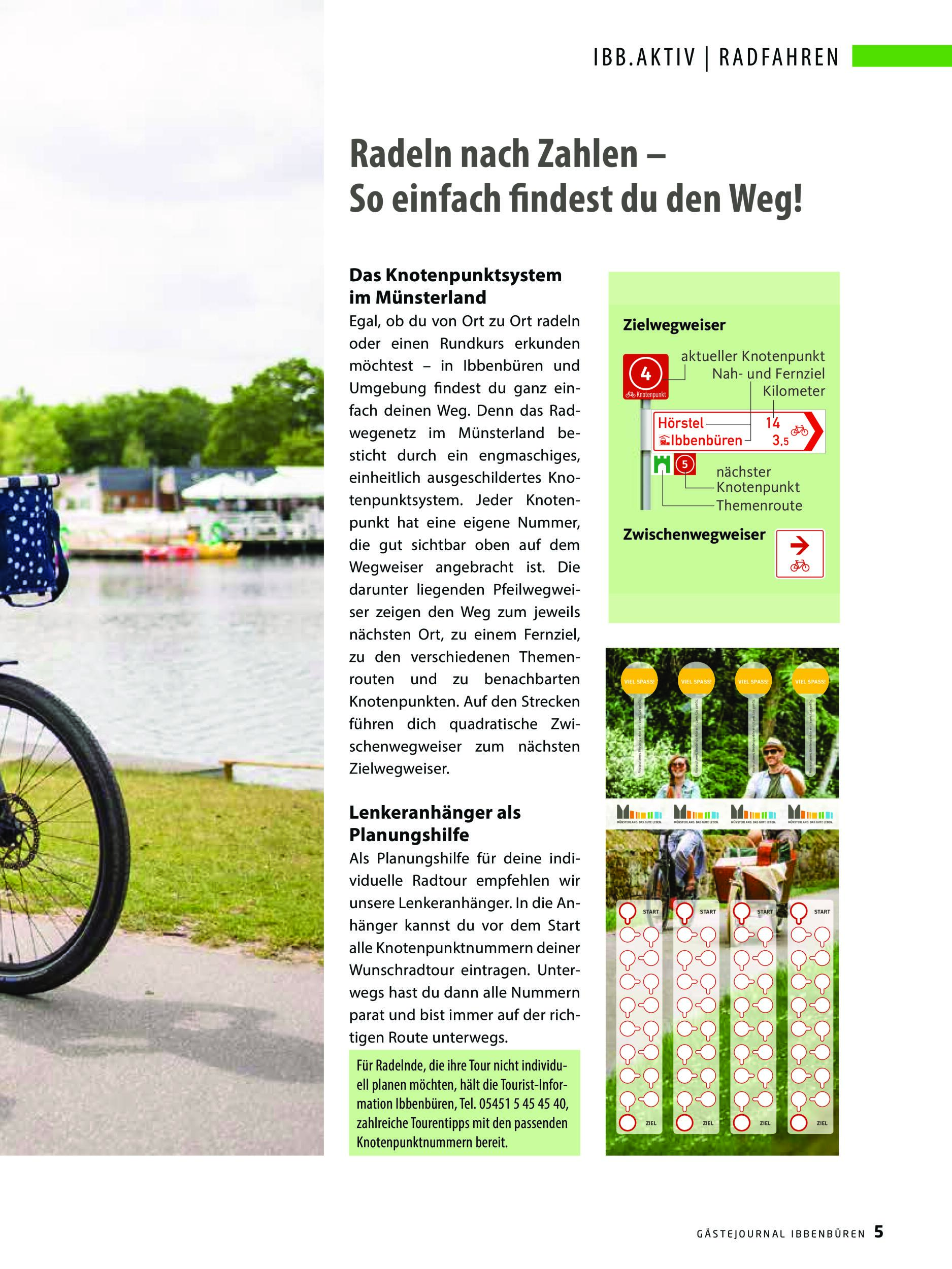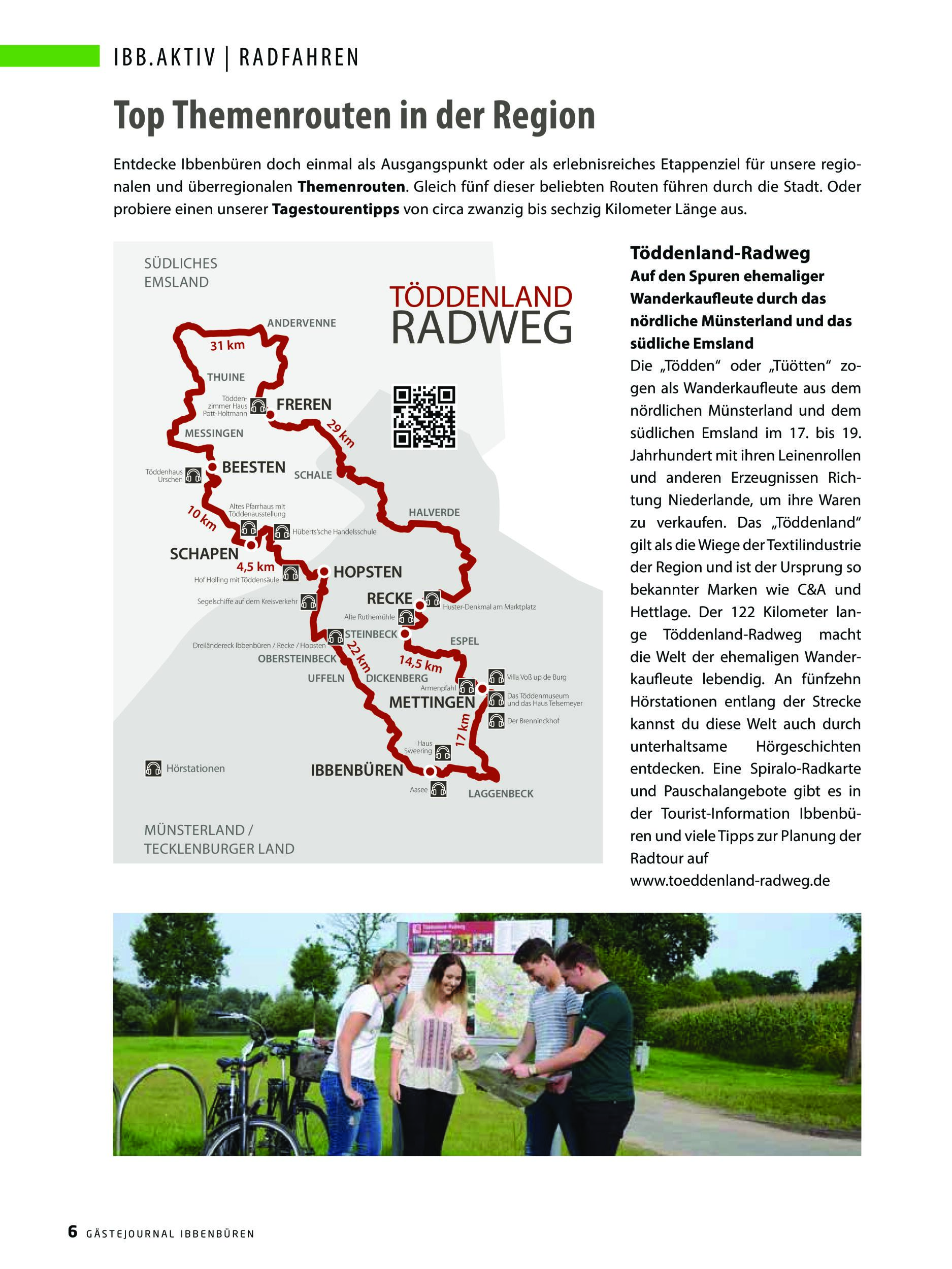 Mit zahlreichen Tipps und Informationen gibt das Gästejournal Ibbenbüren einen umfassenden Überblick über die Ibbenbürener Freizeiteinrichtungen sowie über Veranstaltungshighlights in der Innenstadt und in den Ortsteilen. In dem Journal wird über die Themen Wandern und Radeln ebenso informiert wie über Stadtführungen und kulturelle Angebote. Auch Ausflugsziele wie Dörenther Klippen, die Sommerrodelbahn, der Kletterwald, der NaturaGart-Park, das Aaseebad und die Ibbenbürener Museen sind in dem Journal enthalten.