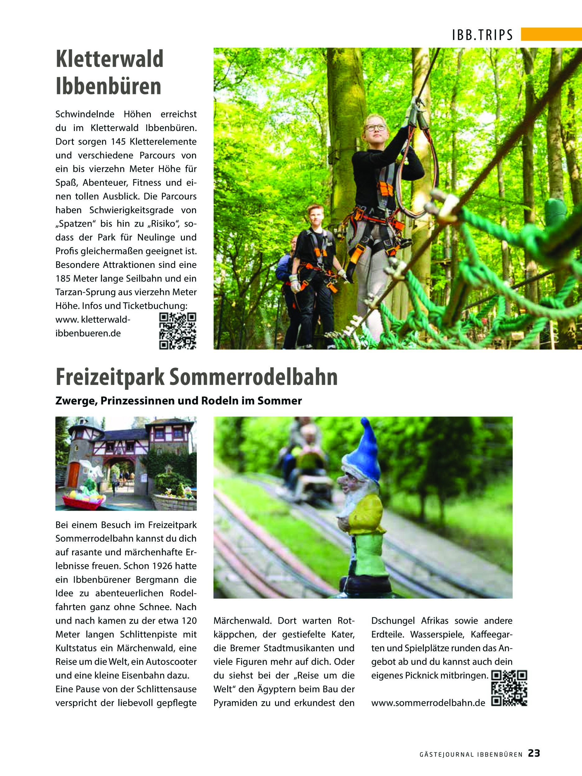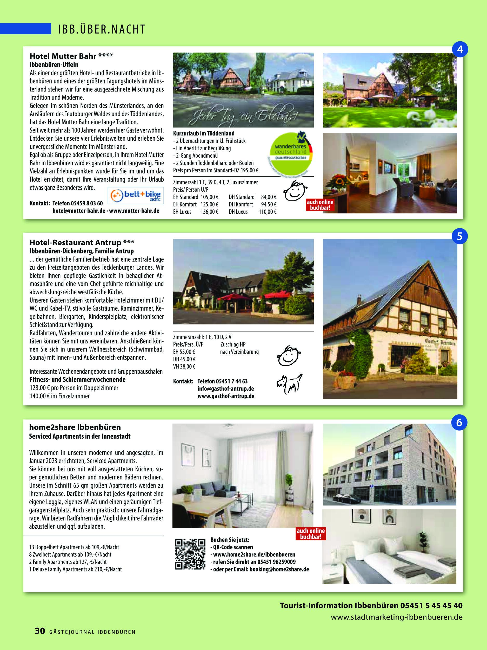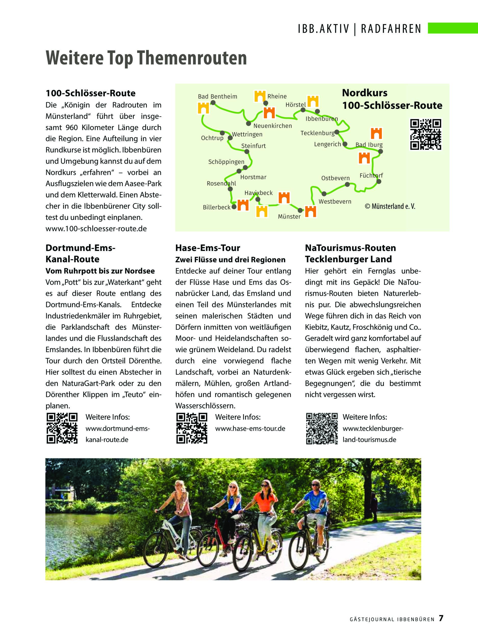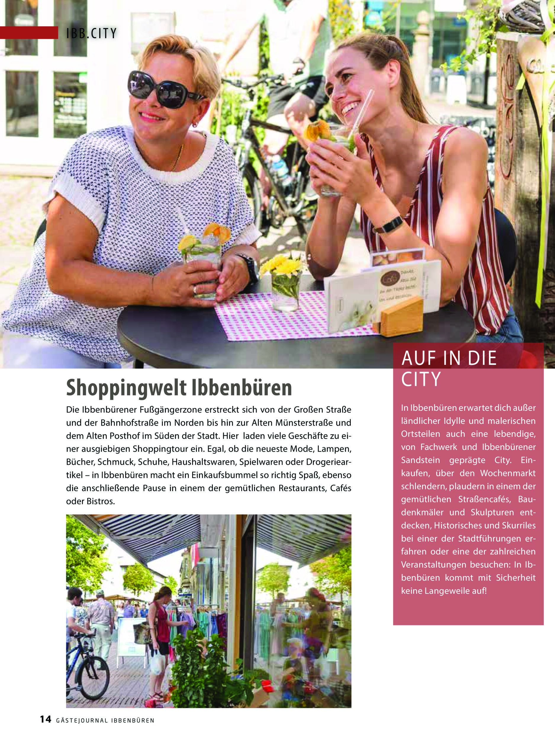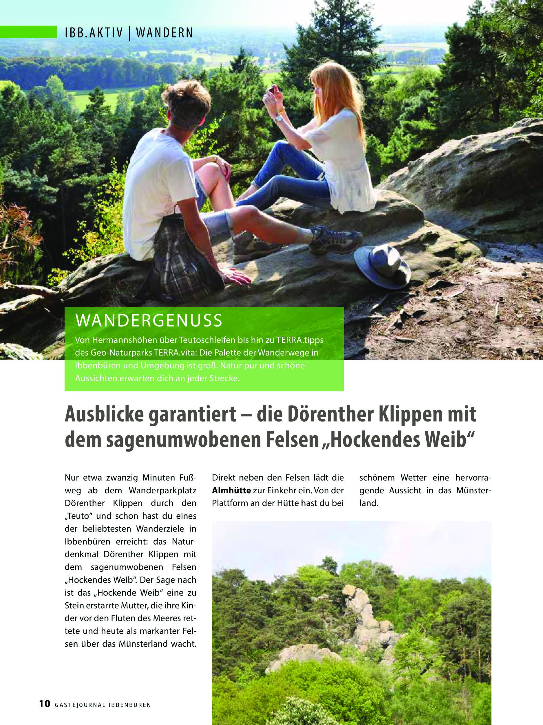 Mit zahlreichen Tipps und Informationen gibt das Gästejournal Ibbenbüren einen umfassenden Überblick über die Ibbenbürener Freizeiteinrichtungen sowie über Veranstaltungshighlights in der Innenstadt und in den Ortsteilen. In dem Journal wird über die Themen Wandern und Radeln ebenso informiert wie über Stadtführungen und kulturelle Angebote. Auch Ausflugsziele wie Dörenther Klippen, die Sommerrodelbahn, der Kletterwald, der NaturaGart-Park, das Aaseebad und die Ibbenbürener Museen sind in dem Journal enthalten.