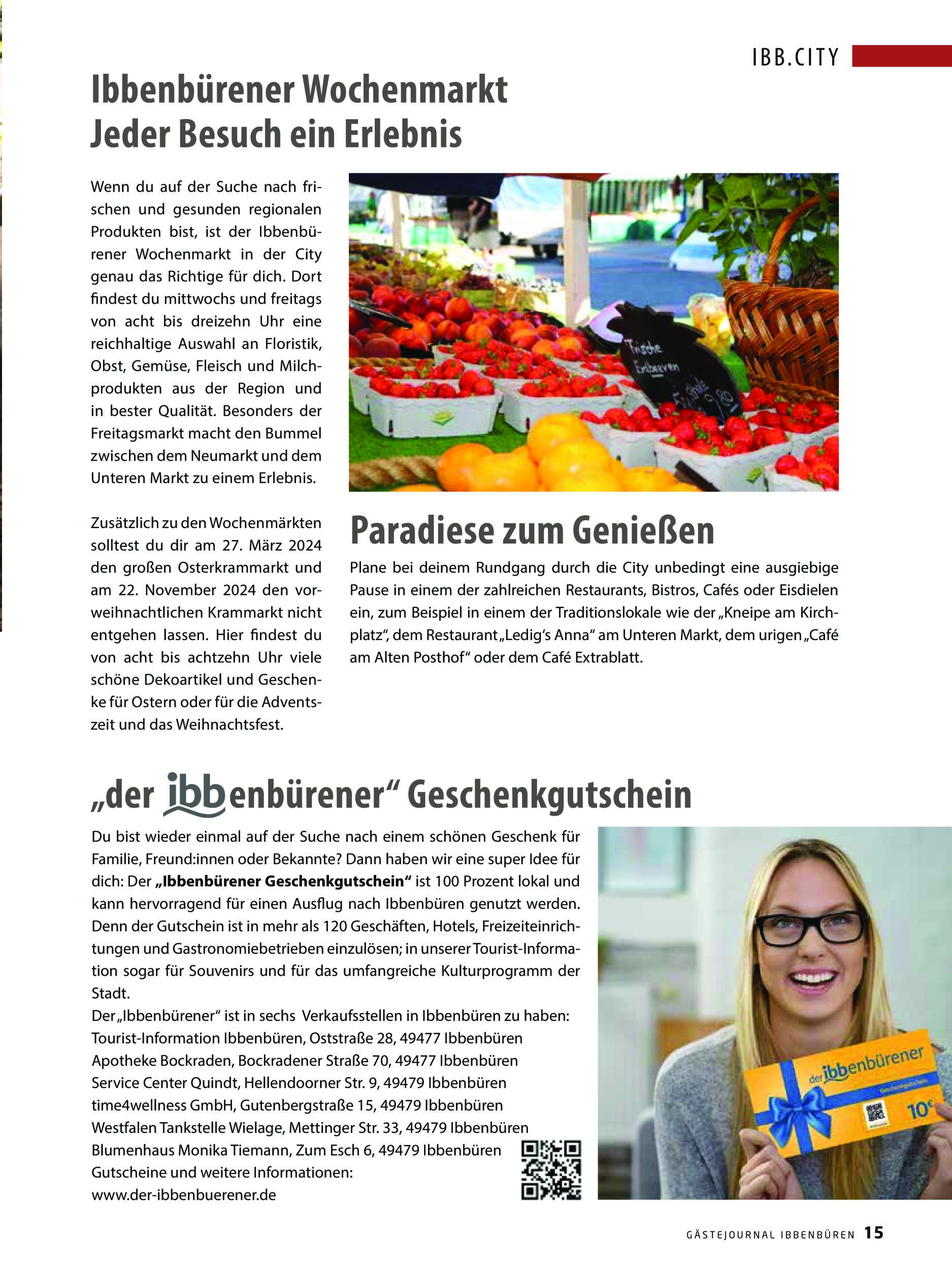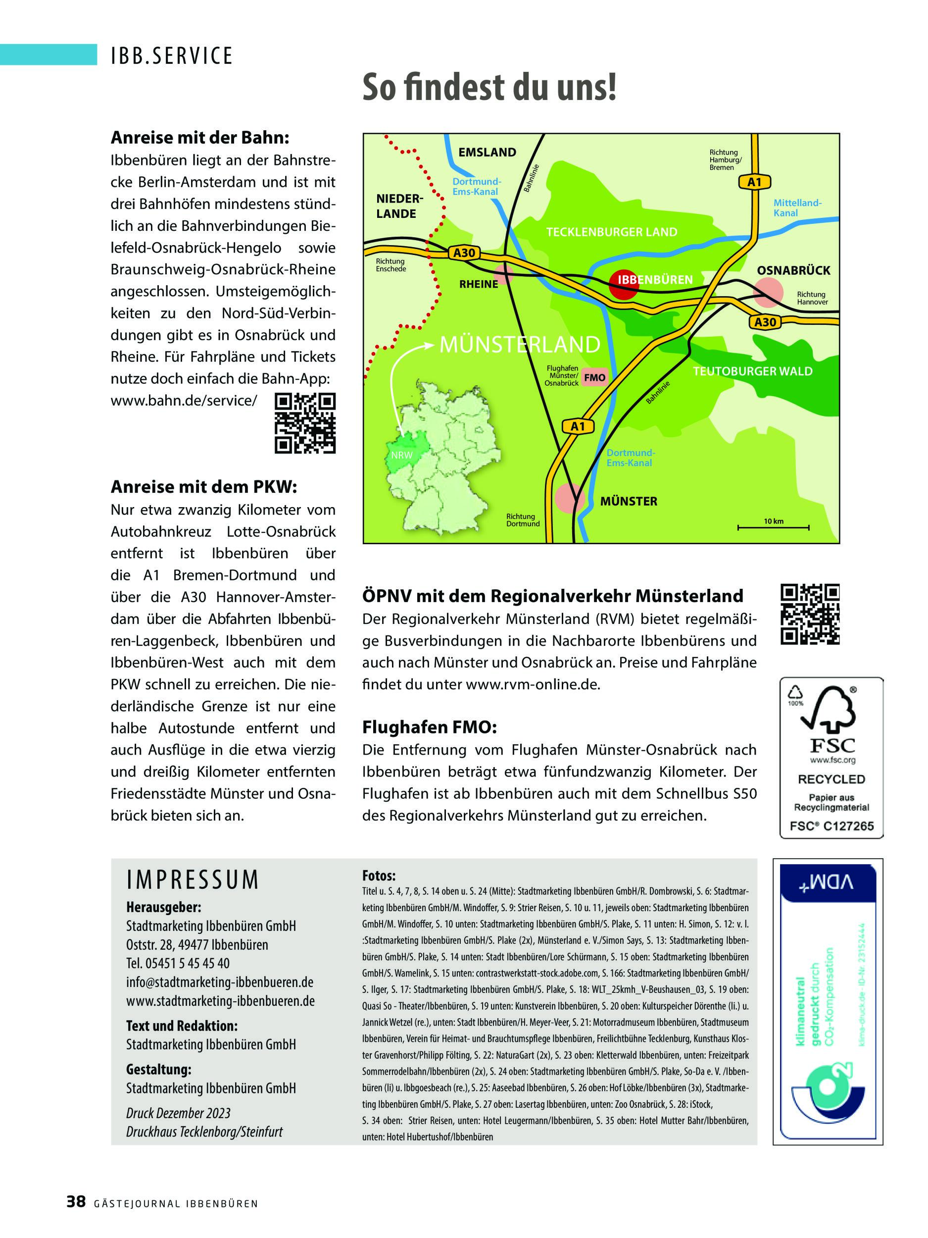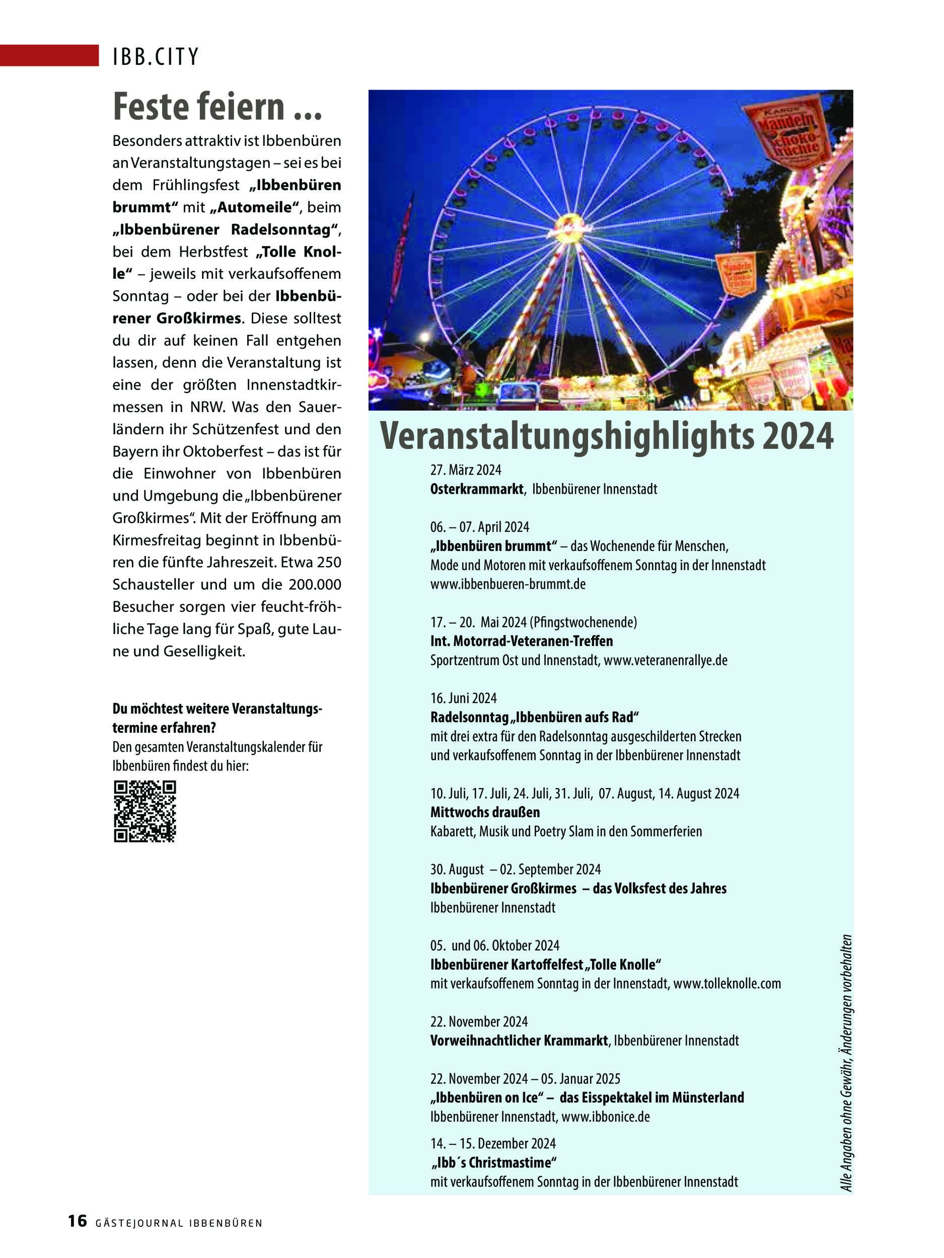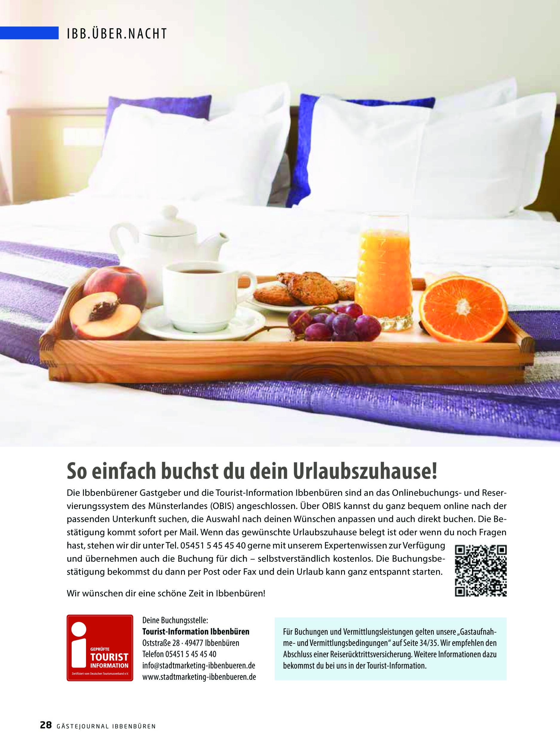 Mit zahlreichen Tipps und Informationen gibt das Gästejournal Ibbenbüren einen umfassenden Überblick über die Ibbenbürener Freizeiteinrichtungen sowie über Veranstaltungshighlights in der Innenstadt und in den Ortsteilen. In dem Journal wird über die Themen Wandern und Radeln ebenso informiert wie über Stadtführungen und kulturelle Angebote. Auch Ausflugsziele wie Dörenther Klippen, die Sommerrodelbahn, der Kletterwald, der NaturaGart-Park, das Aaseebad und die Ibbenbürener Museen sind in dem Journal enthalten.
