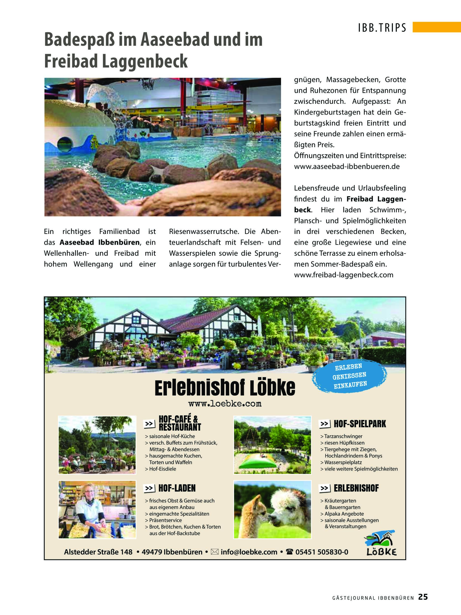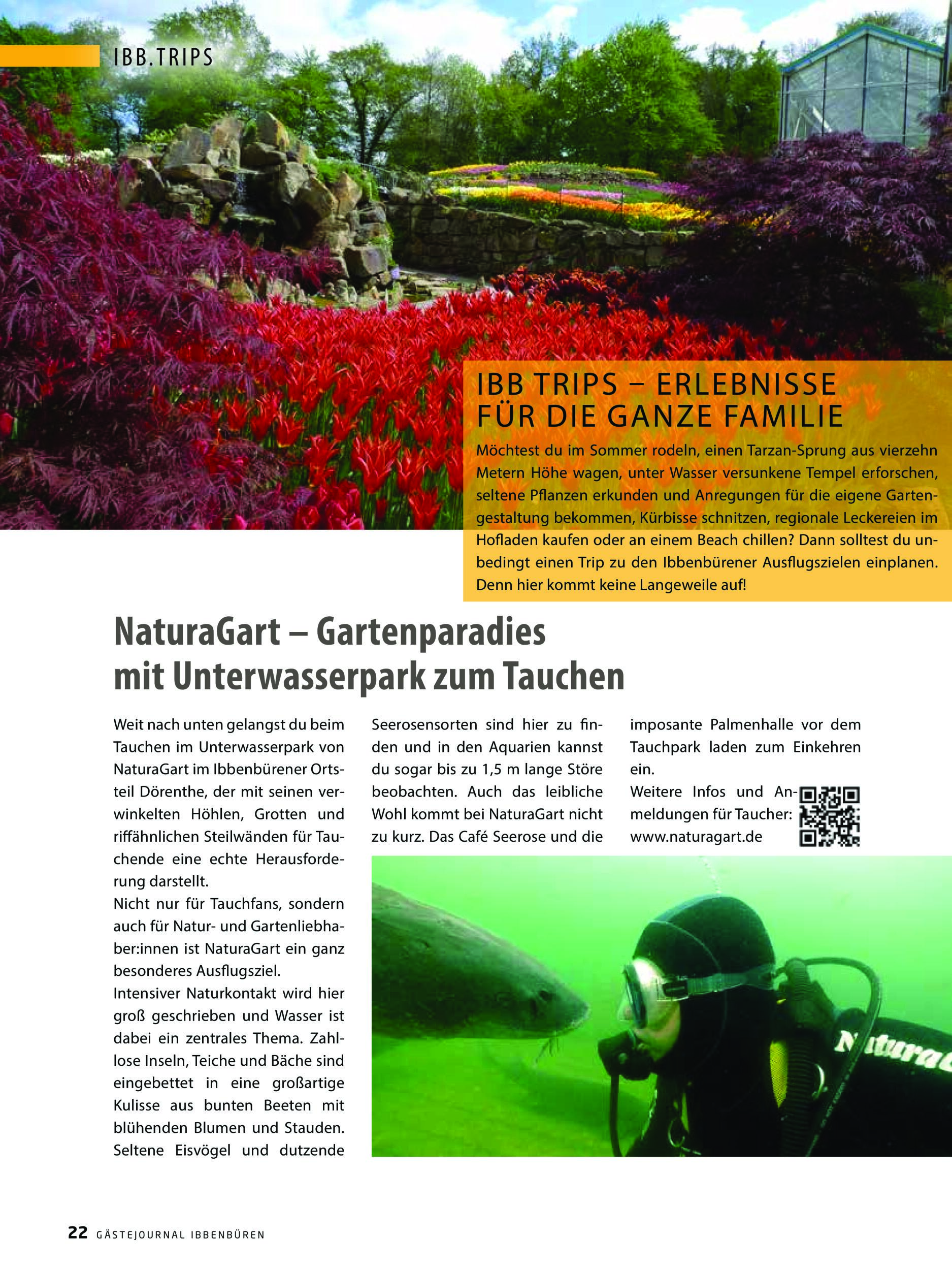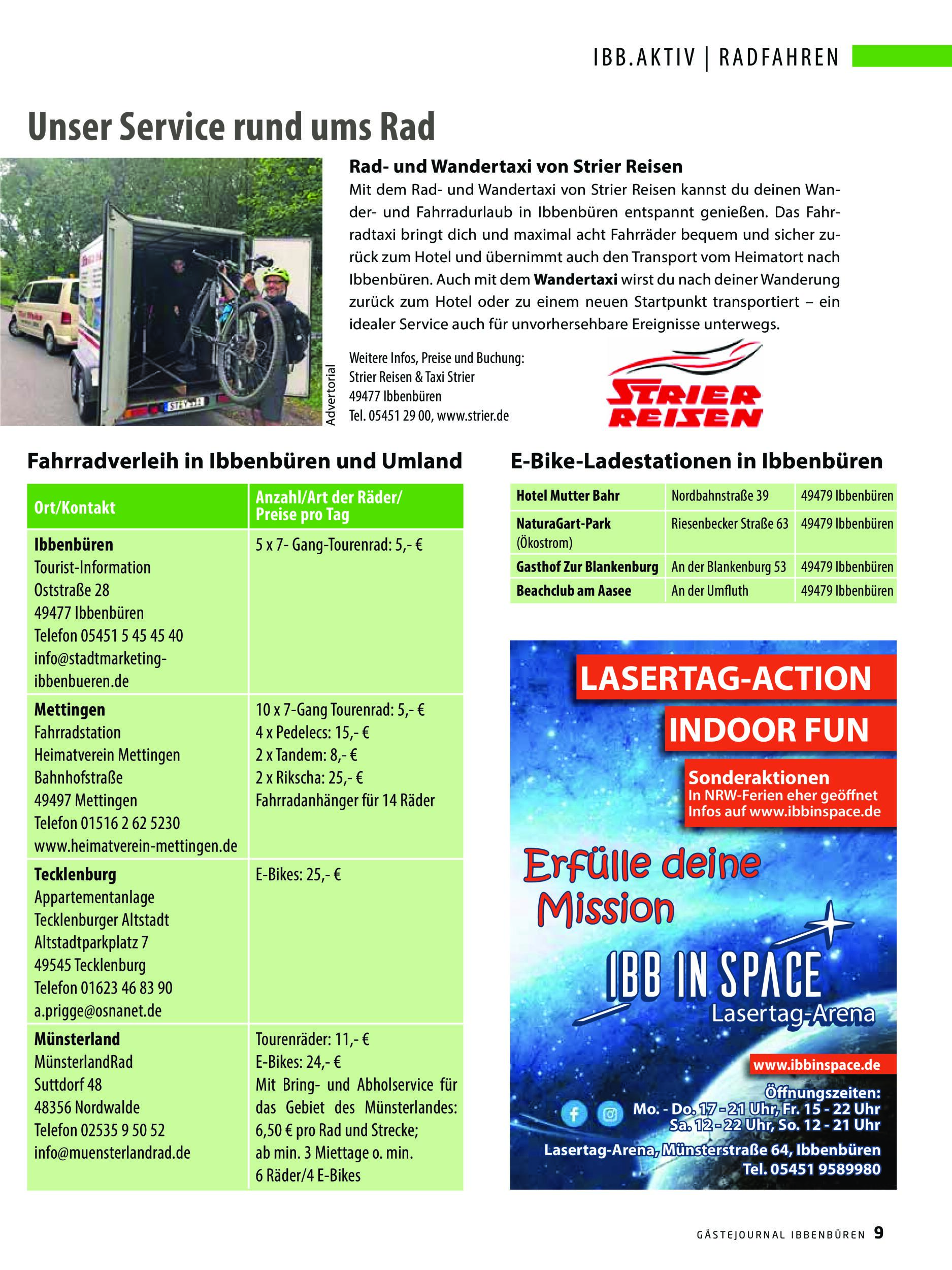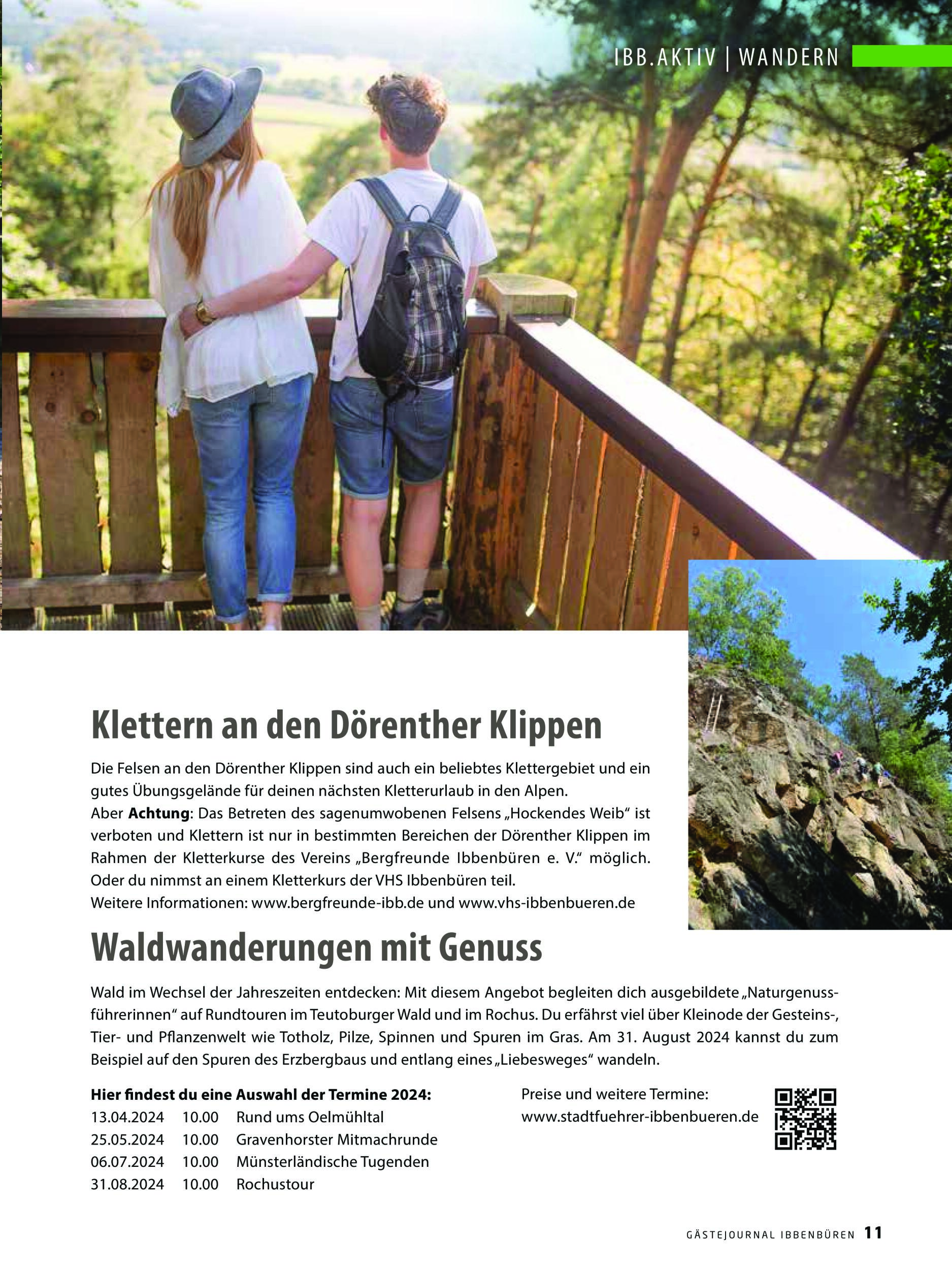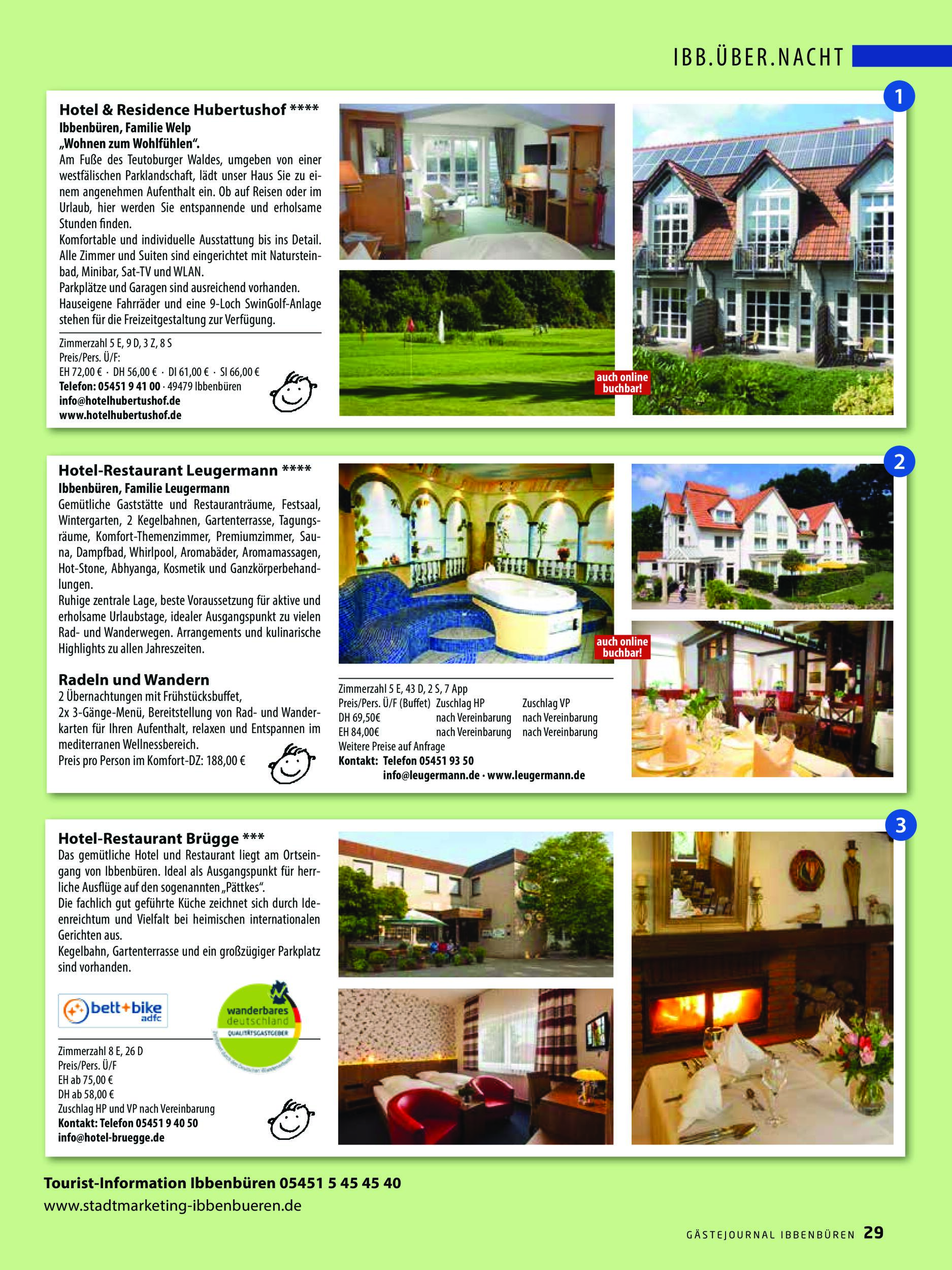 Mit zahlreichen Tipps und Informationen gibt das Gästejournal Ibbenbüren einen umfassenden Überblick über die Ibbenbürener Freizeiteinrichtungen sowie über Veranstaltungshighlights in der Innenstadt und in den Ortsteilen. In dem Journal wird über die Themen Wandern und Radeln ebenso informiert wie über Stadtführungen und kulturelle Angebote. Auch Ausflugsziele wie Dörenther Klippen, die Sommerrodelbahn, der Kletterwald, der NaturaGart-Park, das Aaseebad und die Ibbenbürener Museen sind in dem Journal enthalten.