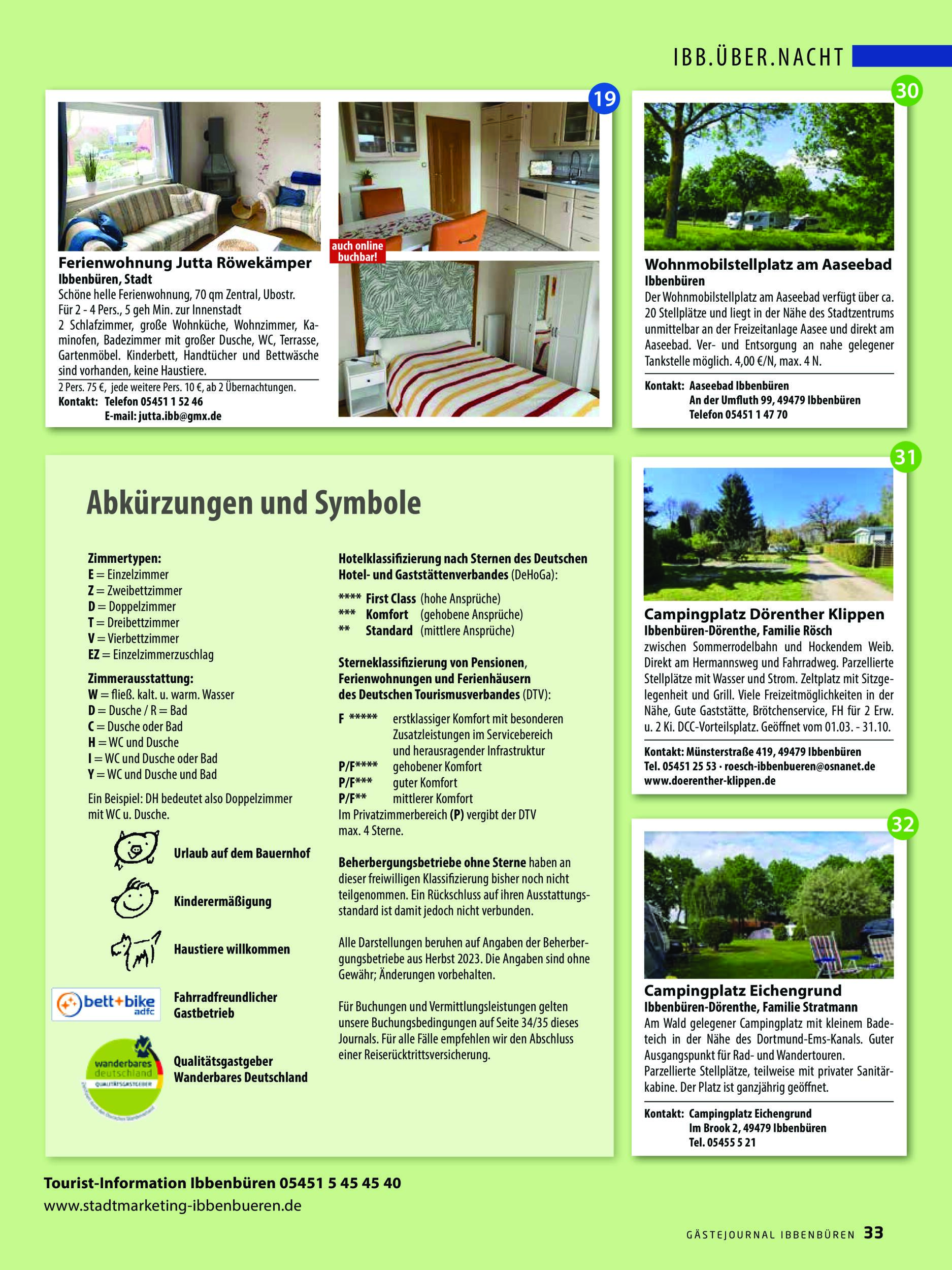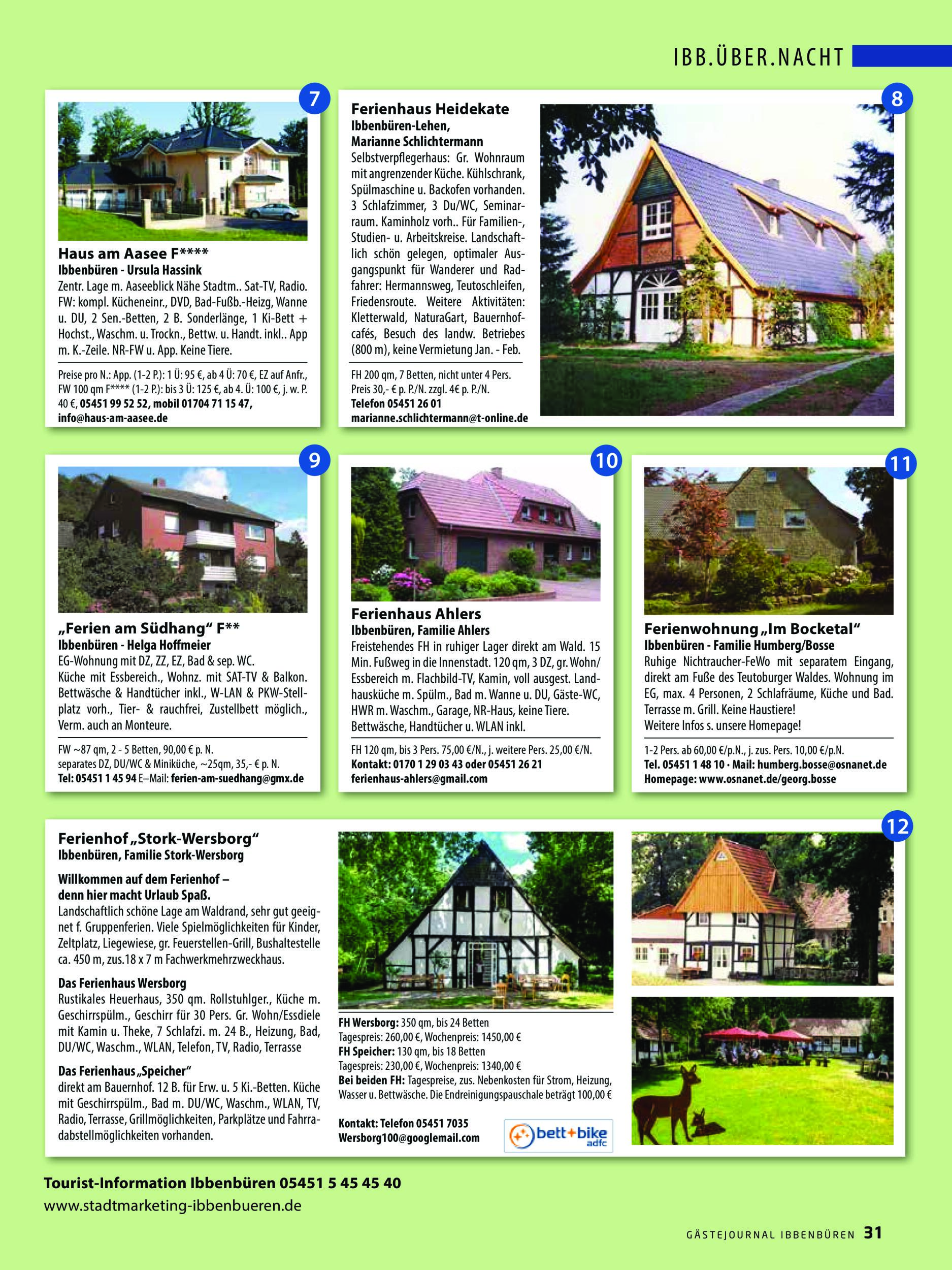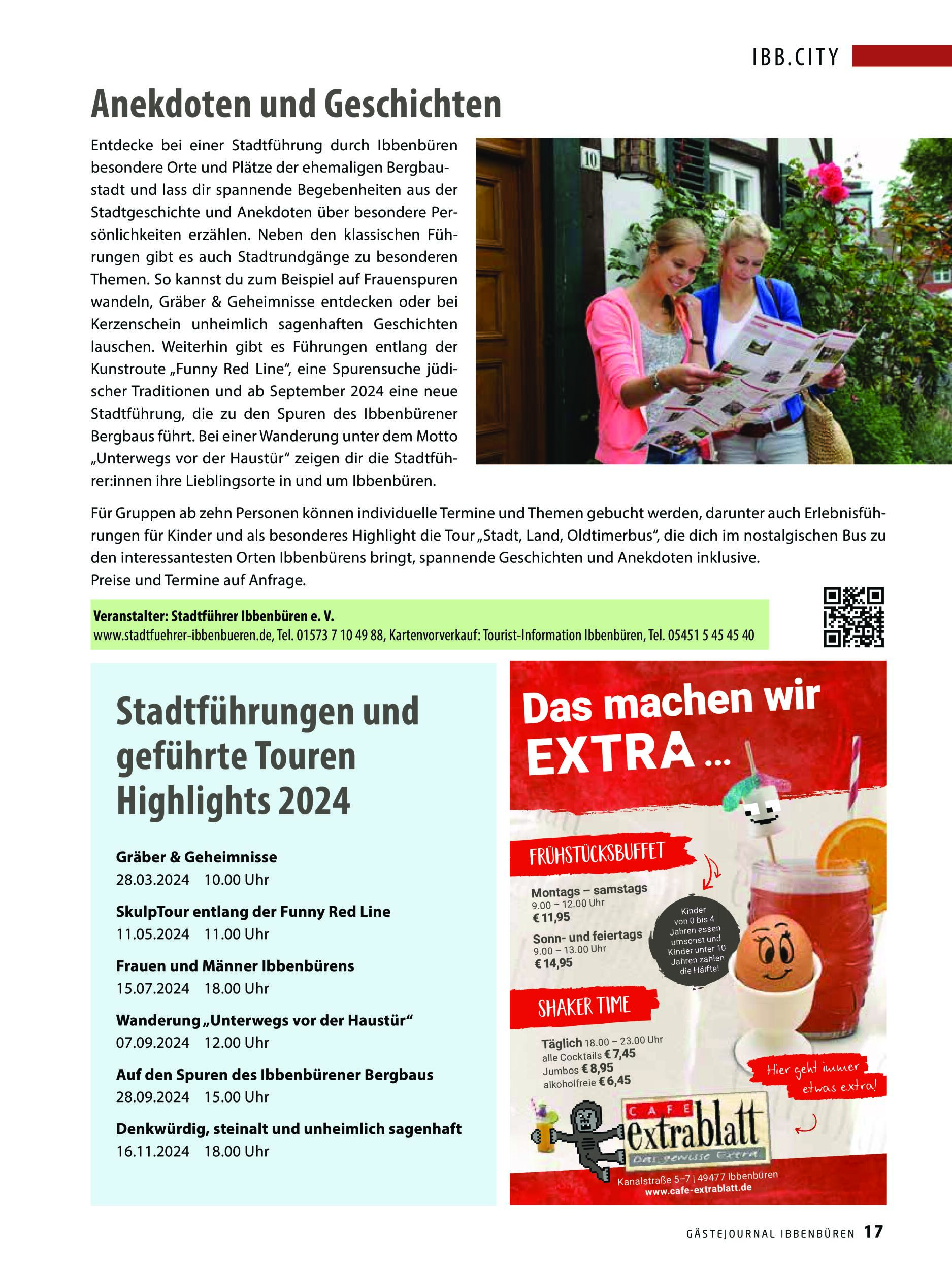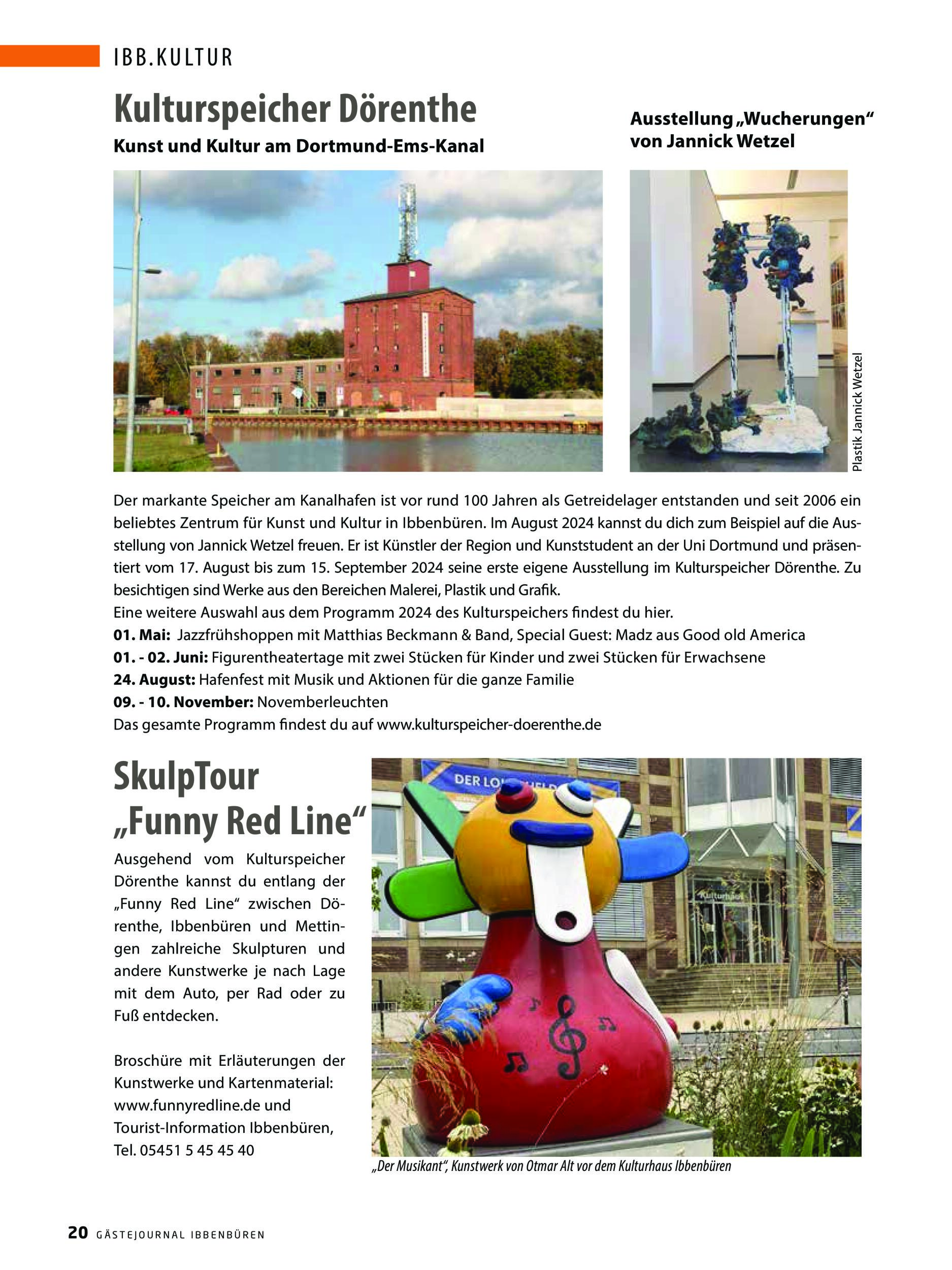 Mit zahlreichen Tipps und Informationen gibt das Gästejournal Ibbenbüren einen umfassenden Überblick über die Ibbenbürener Freizeiteinrichtungen sowie über Veranstaltungshighlights in der Innenstadt und in den Ortsteilen. In dem Journal wird über die Themen Wandern und Radeln ebenso informiert wie über Stadtführungen und kulturelle Angebote. Auch Ausflugsziele wie Dörenther Klippen, die Sommerrodelbahn, der Kletterwald, der NaturaGart-Park, das Aaseebad und die Ibbenbürener Museen sind in dem Journal enthalten.