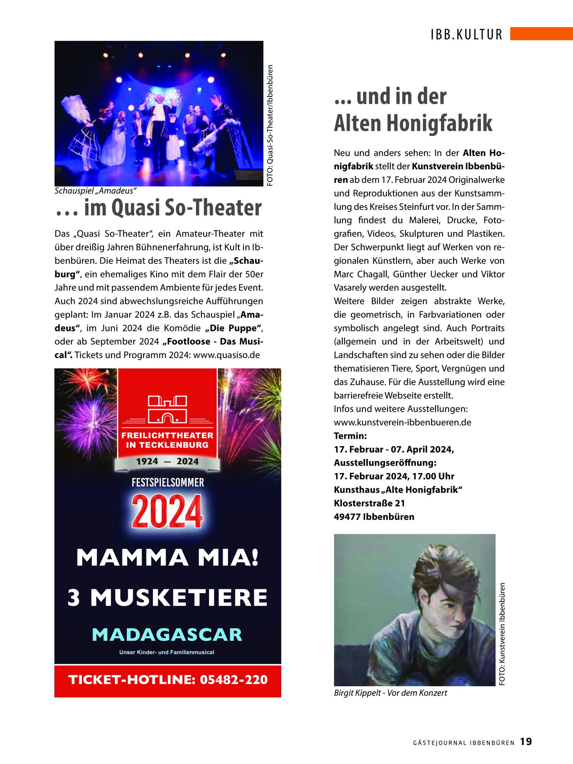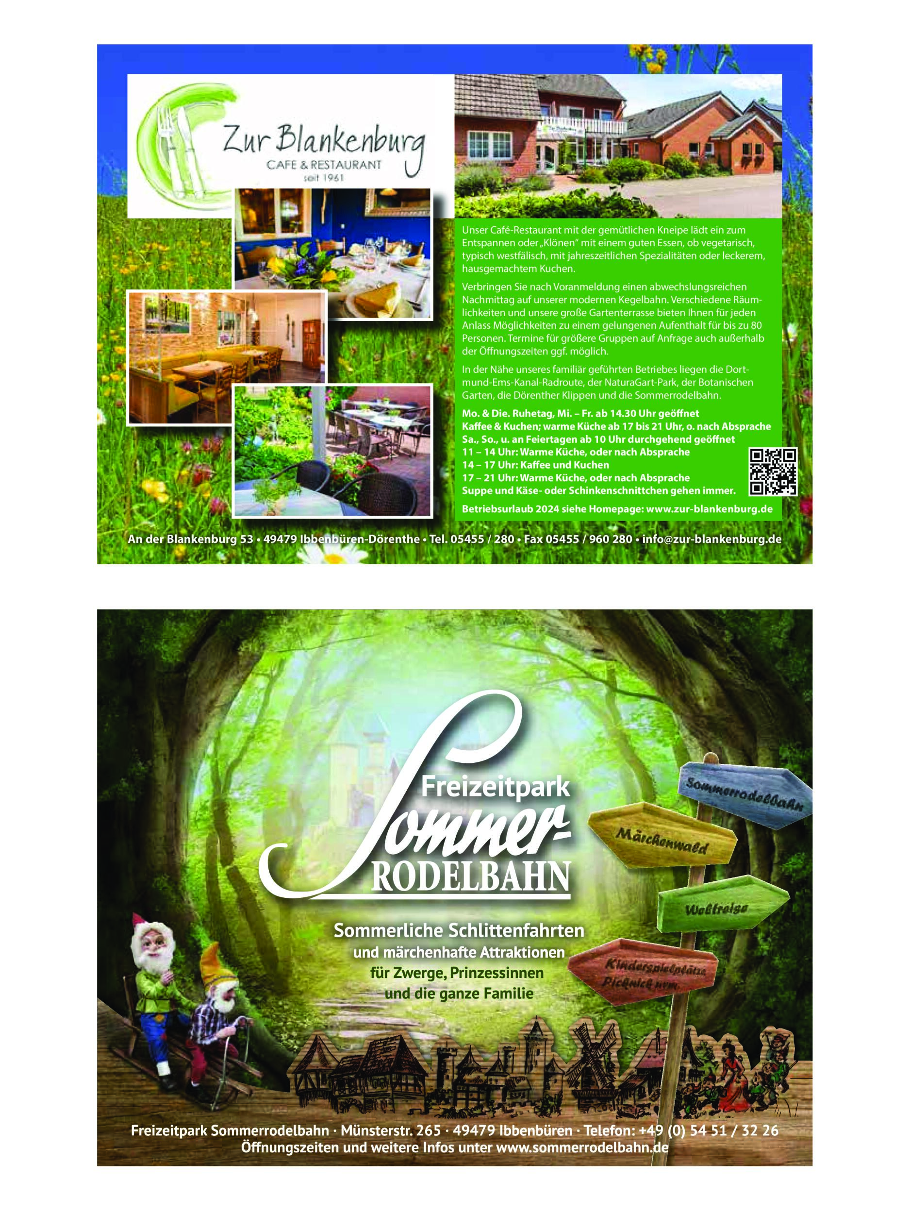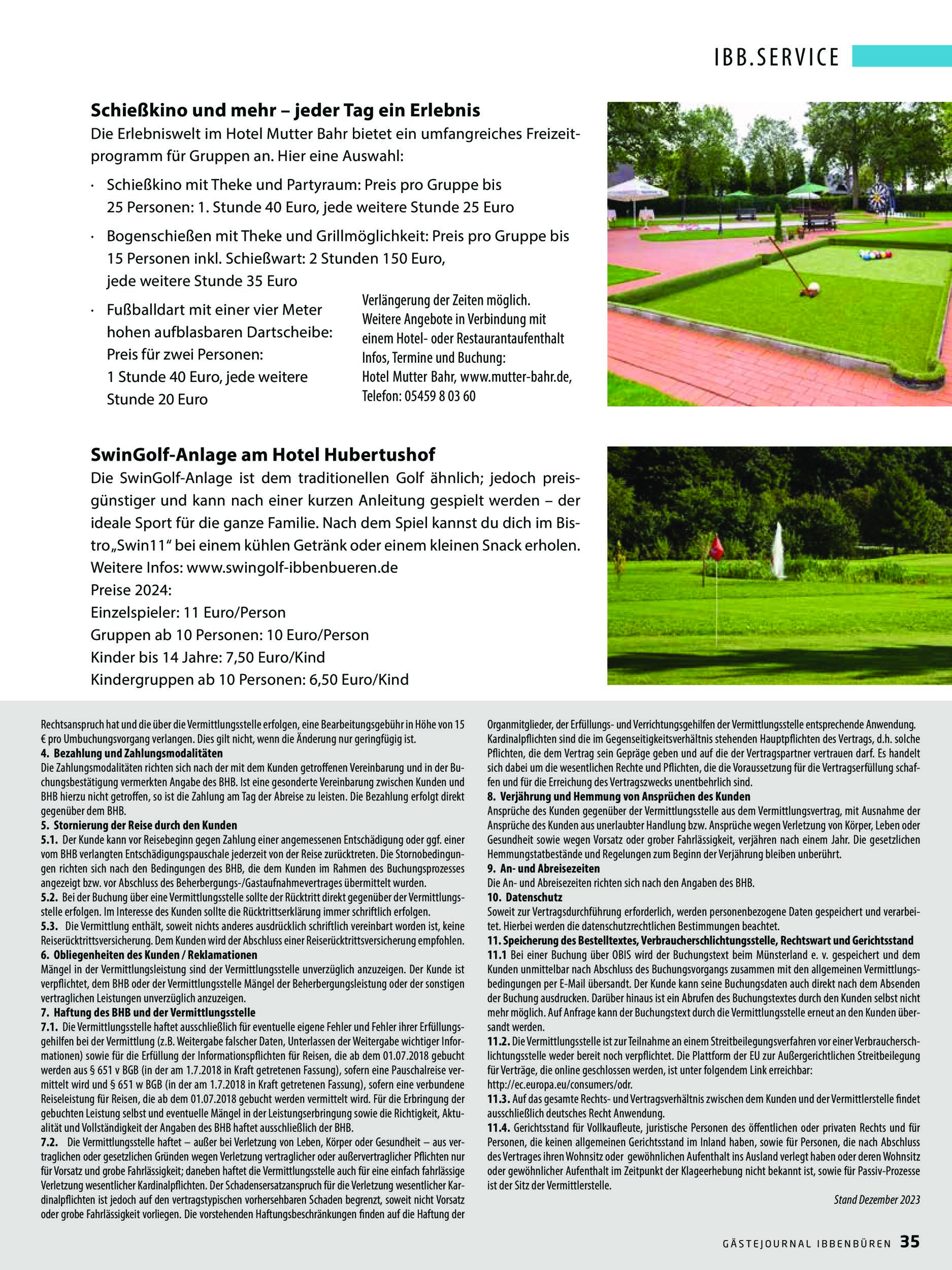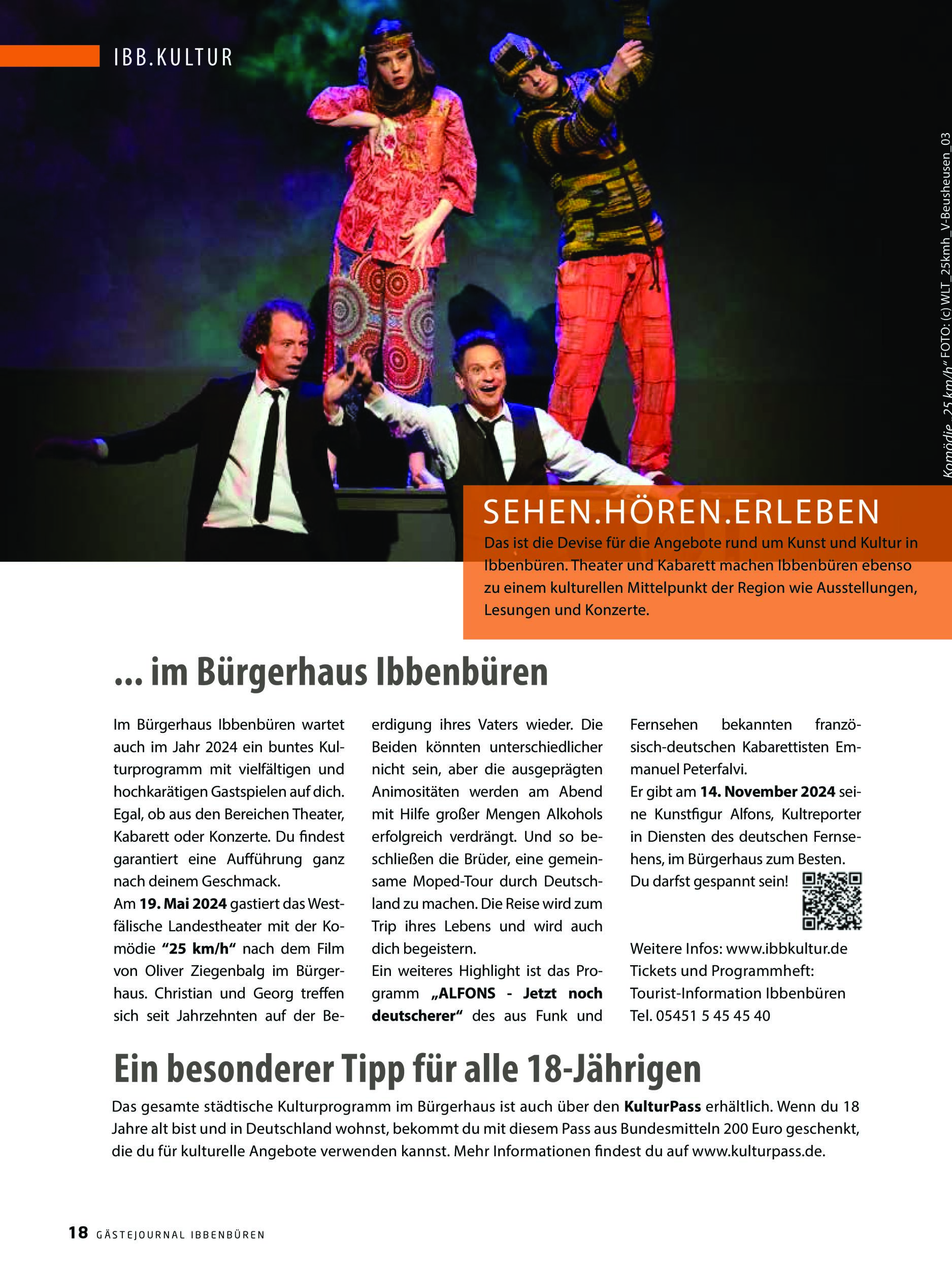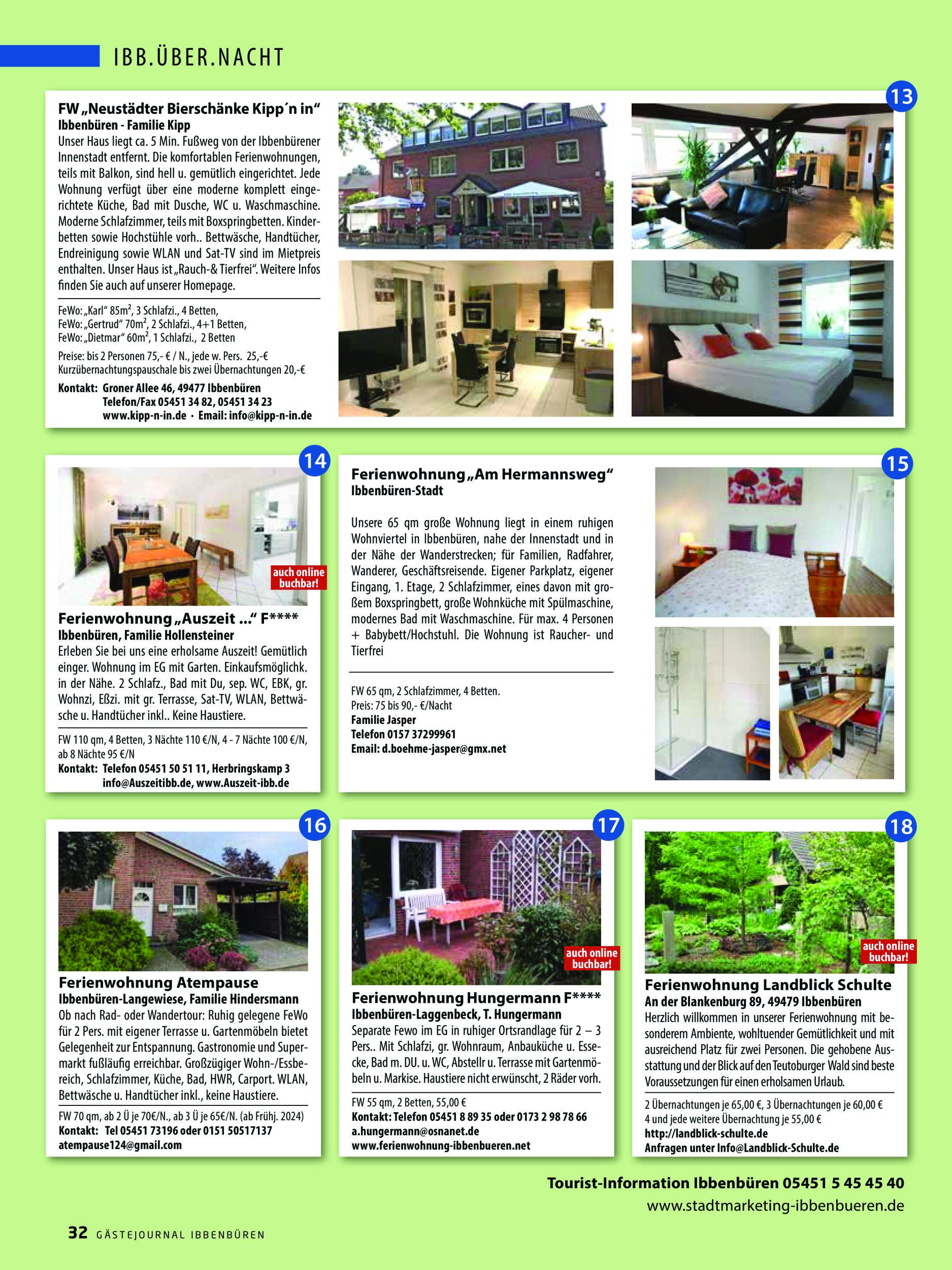 Mit zahlreichen Tipps und Informationen gibt das Gästejournal Ibbenbüren einen umfassenden Überblick über die Ibbenbürener Freizeiteinrichtungen sowie über Veranstaltungshighlights in der Innenstadt und in den Ortsteilen. In dem Journal wird über die Themen Wandern und Radeln ebenso informiert wie über Stadtführungen und kulturelle Angebote. Auch Ausflugsziele wie Dörenther Klippen, die Sommerrodelbahn, der Kletterwald, der NaturaGart-Park, das Aaseebad und die Ibbenbürener Museen sind in dem Journal enthalten.