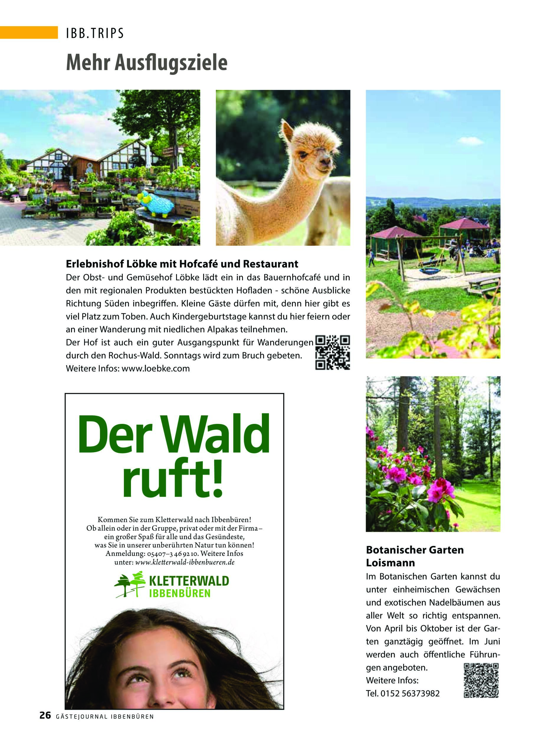 Mit zahlreichen Tipps und Informationen gibt das Gästejournal Ibbenbüren einen umfassenden Überblick über die Ibbenbürener Freizeiteinrichtungen sowie über Veranstaltungshighlights in der Innenstadt und in den Ortsteilen. In dem Journal wird über die Themen Wandern und Radeln ebenso informiert wie über Stadtführungen und kulturelle Angebote. Auch Ausflugsziele wie Dörenther Klippen, die Sommerrodelbahn, der Kletterwald, der NaturaGart-Park, das Aaseebad und die Ibbenbürener Museen sind in dem Journal enthalten.